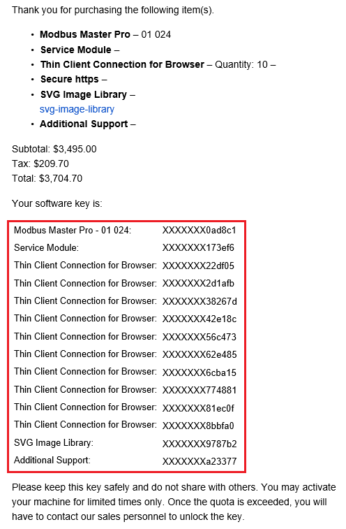The correct way to copy license keys from invoice email is to copy together with module names.